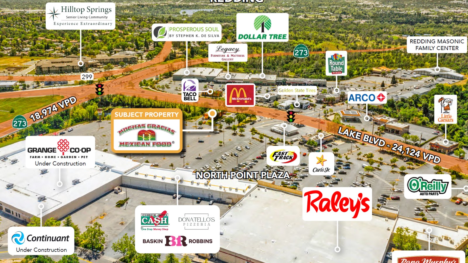 Strategically located in the high-traffic North Point Plaza, this recently renovated Muchas Gracias is backed by a brand-new NNN lease, offering investors true hands-off income. Anchored by a dominant Raley’s grocery store, the property sits at a signalized intersection along Lake Blvd—the busiest I-5 exit in northwest Redding. With strong visibility, zero grocery competition in the trade area, and a growing tenant making its California debut, this asset checks every box.